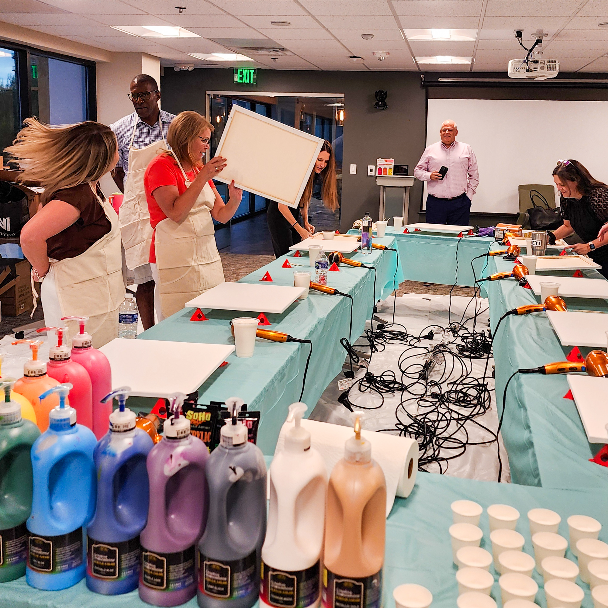 We Bring Everything – Seriously, everything. From canvases to hair dryers, we set up a no-stress, mess-free* space so you can focus on the fun. (*Don’t worry—paint ends up on our tarps, not your stuff!)